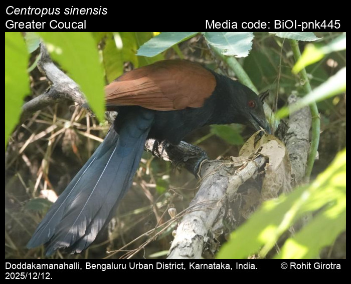 Anonymous 2026. Centropus sinensis (Stephens, 1815) – Greater Coucal. In Satose, V., A. Bayani, V. Ramachandran, P. Roy, and K. Kunte (Chief Editors). Butterflies of India, v. 2.17. Published by the Indian Foundation for Butterflies. URL: https://www.birdsofindia.org/centropus-sinensis, accessed 2026/02/02.